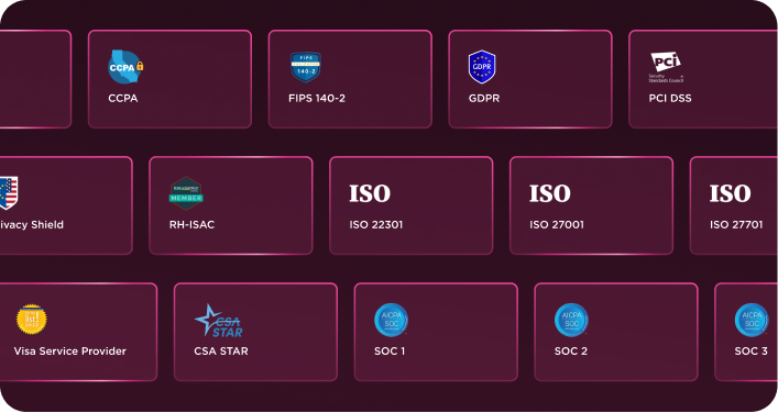 We provide critical security and compliance for enterprise brands worldwide with an ever-growing list of Tier 1 compliant including ISO, SOC, PCI, FIPS, RH-ISAC, GDPR, and CCPA.