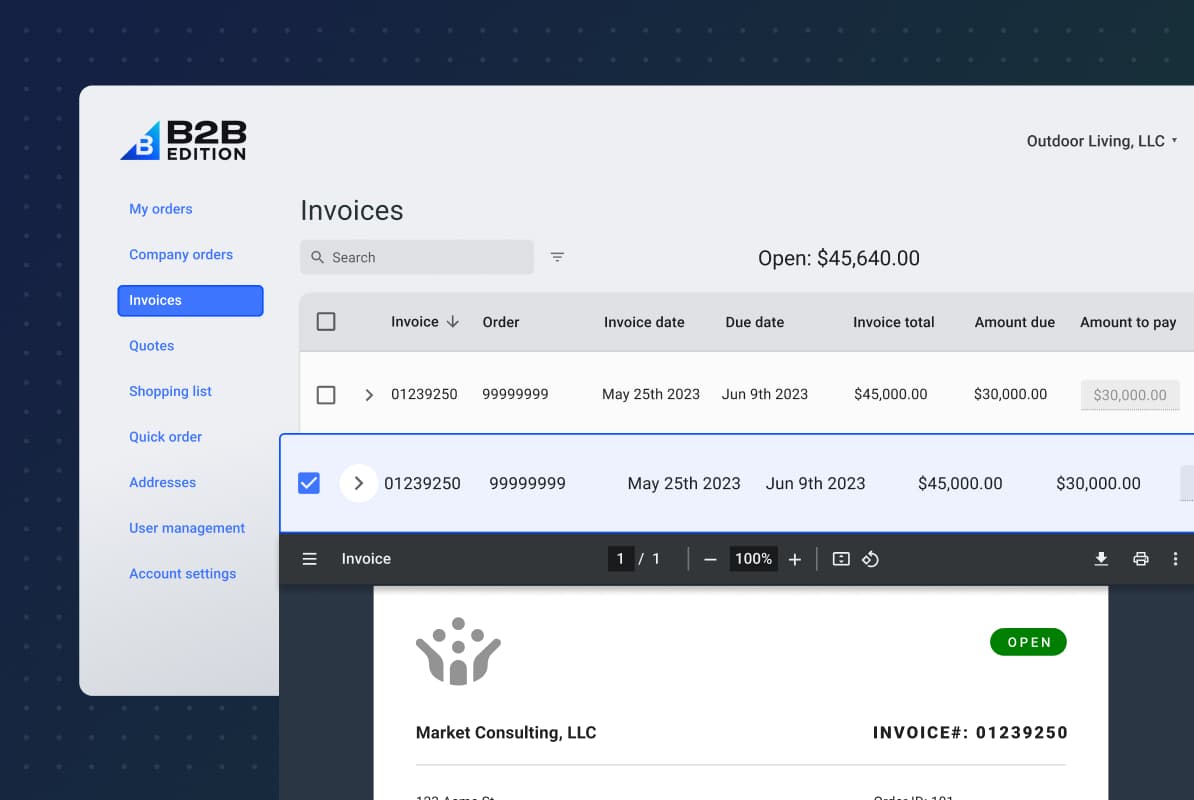 Unlock the most cutting-edge tools for B2B businesses, like advanced account management, company account credit management, flexible payment options, AI quoting, and an extensive sales rep portal. Get started with a Buyer Portal that’s ready for launch, out-of-the-box — or customize more through our open-source architecture.