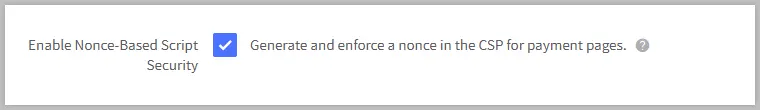 In the control panel Security & Privacy settings, toggling the Enable Nonce-Based Script Security setting generates a random nonce value for every page request. The nonce is added to the Content-Security Policy (CSP) header of pages that involve the collection of credit card information such as checkout and account pages.