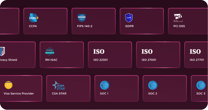 We provide critical security and compliance for enterprise brands worldwide with an ever-growing list of Tier 1 compliant including ISO, SOC, PCI, FIPS, RH-ISAC, GDPR, and CCPA.