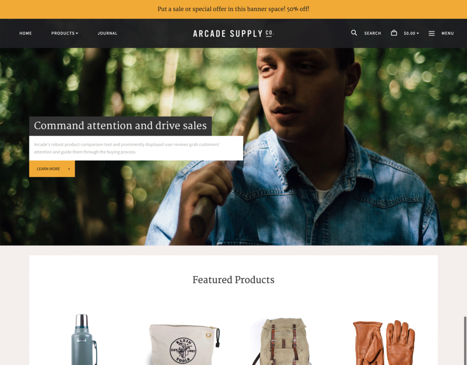Arcade is an eye-catching theme designed to drive sales. In-depth product comparison, prominently displayed user reviews, and bold call-to-action buttons grab your customers' attention and guide them through the buying process. With multiple navigation styles and customizable colors, Arcade is as flexible as it is brandable.