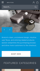 Brixton is a highly versatile, brandable theme optimized for large inventory stores. Visually clean and functionally robust, it features persistent left-hand navigation, animated drill-down menus, and detailed product pages that make it easy to convey your products’ features and benefits. Build your brand and scale your business with a theme that’s as easy to set up as it is to shop.