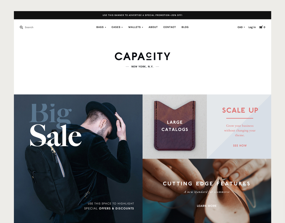 Capacity sets a new standard for ecommerce navigation and search functionality. With its customizable mega-navigation, robust product filtering, and unique modular slideshow area, Capacity is powerful enough to handle the largest inventories—and look good doing it.