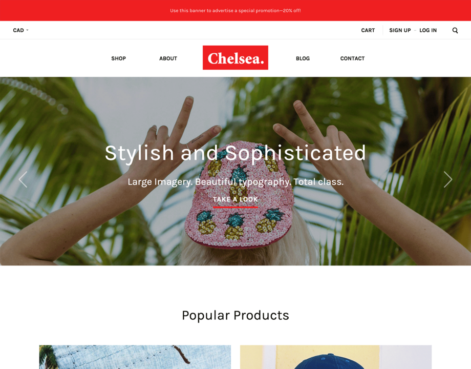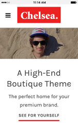 Chelsea helps you create the perfect online lookbook. Its large imagery and elegant typography let your products tell the story, while making your customers feel like they've walked into a high-end boutique. Whether you're selling clothing, jewelry, or health and beauty products, Chelsea is the perfect home for your premium lifestyle brand.