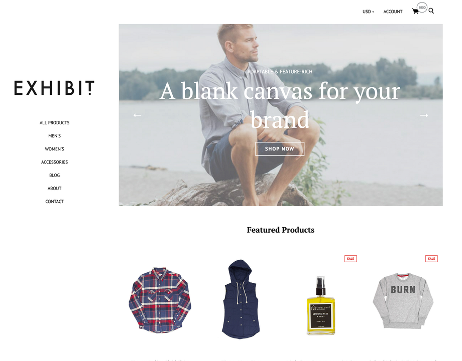 Exhibit is a handsome and feature-rich theme optimized for small-to-medium-sized catalogs. Classic sidebar navigation and distinctive blog post treatment combine to create a design that's enduring, unexpected and easily brandable. Exhibit your products with a theme that does them justice.