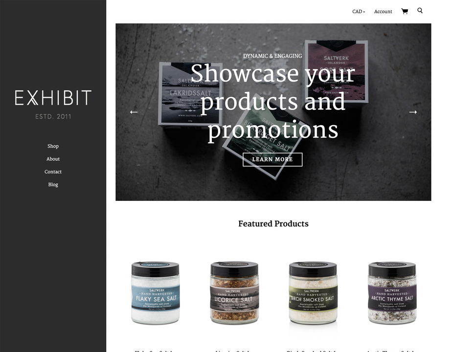 Exhibit is a handsome and feature-rich theme optimized for small-to-medium-sized catalogs. Classic sidebar navigation and distinctive blog post treatment combine to create a design that's enduring, unexpected and easily brandable. Exhibit your products with a theme that does them justice.
