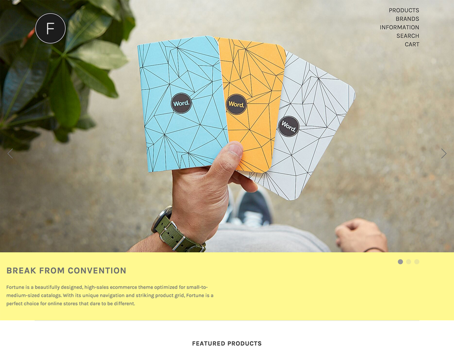 Fortune is a standout theme for cutting-edge online stores. Customers will be transfixed by its striking hero area, which puts your imagery on full display, along with its sleek navigation and unique product grid. Ideal for small-to-medium-sized catalogs, Fortune has everything you need to command and convert shoppers.
