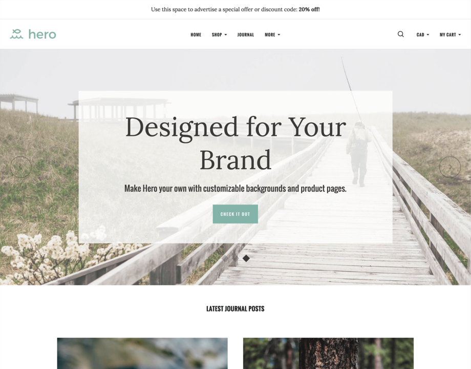 Hero is a flexible and feature-rich theme designed to wow shoppers. Its unique product grid and impactful use of white space call attention to your products, while its customizable background lets you tailor your theme to perfection. Powerful enough to handle any size of inventory, Hero is ideal for boutique and enterprise stores alike.