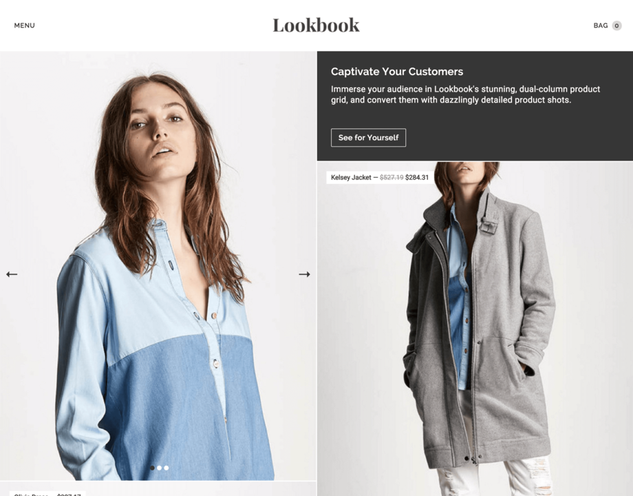 Lookbook takes your product photography to the next level. Immerse your customers in its stunning, dual-column product grid, and captivate them with dazzlingly detailed product shots. Lookbook's sleek design includes a fixed header and nested navigation to keep visitors rooted as they shop your store.
