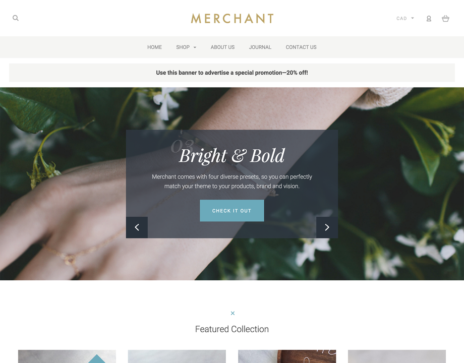 Merchant is a versatile, scalable theme that will grow with your store. Its clean design and four stylish presets provide a space for your products to shine. Ideally suited to catalogs large and small, Merchant is easy to set up, a pleasure to browse, and designed to get your customers to the checkout.