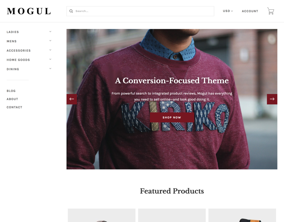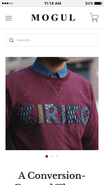 Mogul is a fresh and versatile theme for growing brands. Its persistent left hand navigation and extensible subcategory menus elegantly support large catalogs, while its clean design and merchandisable homepage sections make it a great choice for a wide variety of product types and industries.