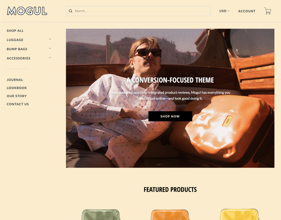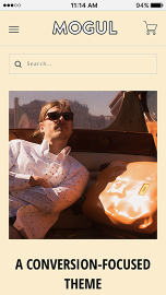 Mogul is a fresh and versatile theme for growing brands. Its persistent left hand navigation and extensible subcategory menus elegantly support large catalogs, while its clean design and merchandisable homepage sections make it a great choice for a wide variety of product types and industries.