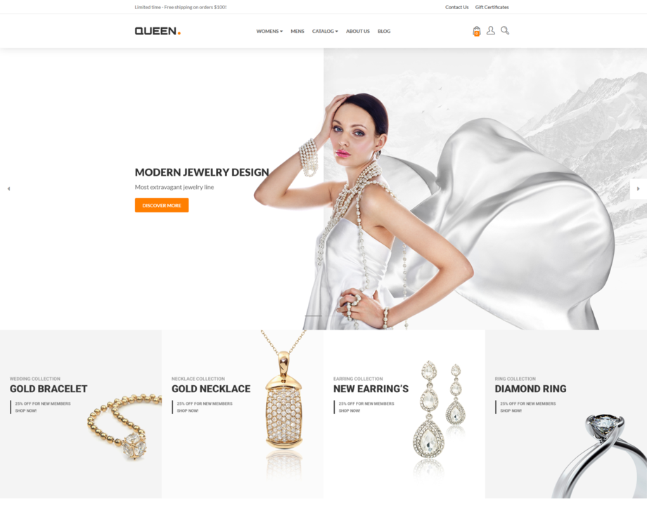 The Queen theme is built from the ground up with Mobile Responsiveness as a top priority. With a responsive design, your website will look great on mobile devices, tablets, and desktops. Featuring a Mega Dropdown Menu, Quickview Products, Product Carousels, faceted search (which is available on select BigCommerce plans) and more.