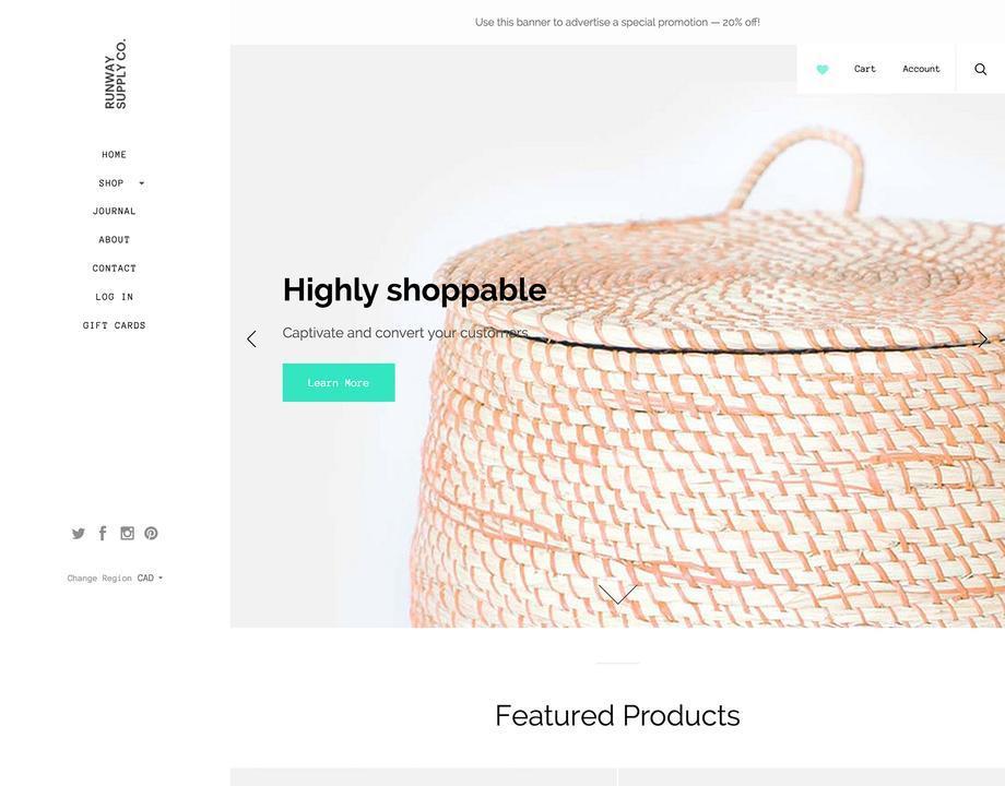 Runway is a gallery theme for stores with exceptional style. Create a memorable first impression with stunning full-width images, tidy sidebar navigation, and homepage features designed to invite customer engagement. Elegant and understated, Runway is a perfect backdrop for your high-end products.