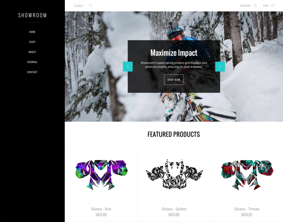 Showroom is a sleek and sophisticated theme designed to keep pace with scaling businesses. Its unique space-saving product grid and customizable sidebar navigation combine to create a theme that's both elegant and powerful. Ideal for any brand, Showroom is easy to set up and infinitely shoppable.