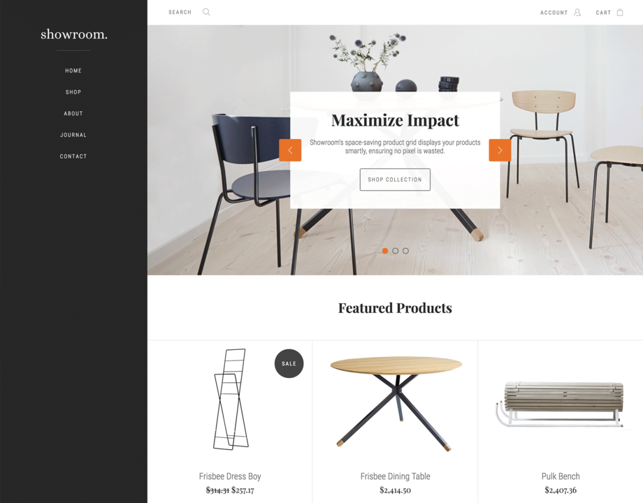 Showroom is a sleek and sophisticated theme designed to keep pace with scaling businesses. Its unique space-saving product grid and customizable sidebar navigation combine to create a theme that's both elegant and powerful. Ideal for any brand, Showroom is easy to set up and infinitely shoppable.