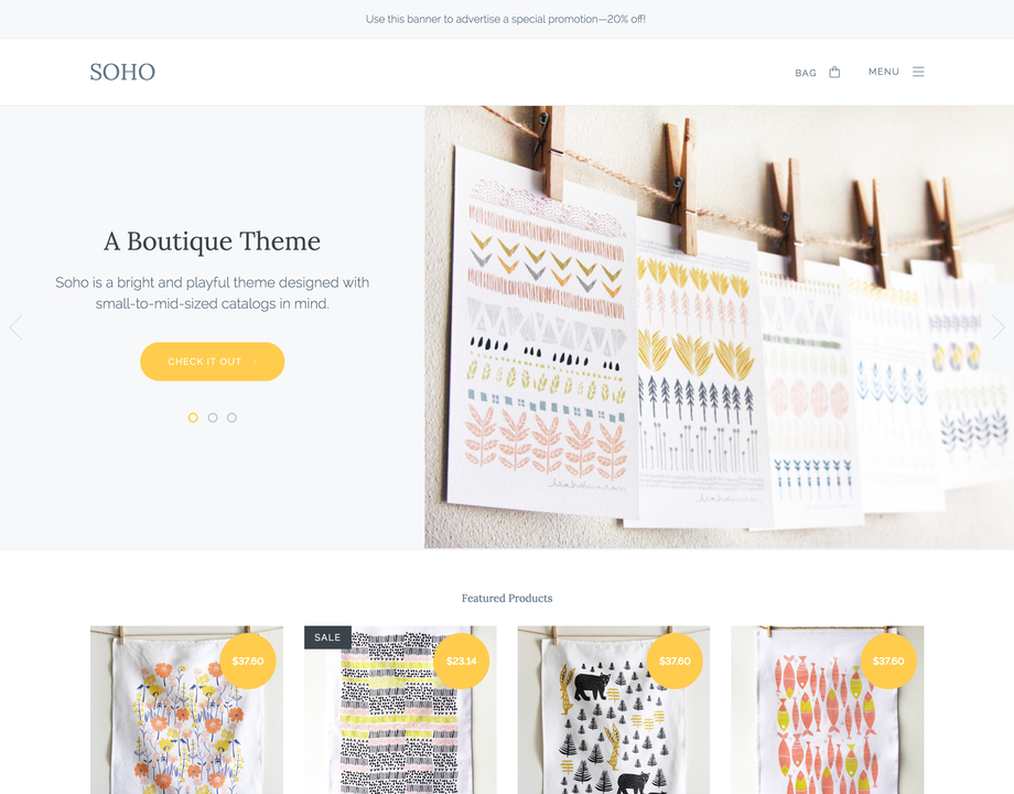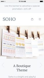 Soho is a bright and playful theme designed with artisans and small businesses in mind. Ample white space and clean typography let you show off your products in style. Colorful buttons and sales-ready calls to action invite customers to engage with your brand and get to the checkout—fast.