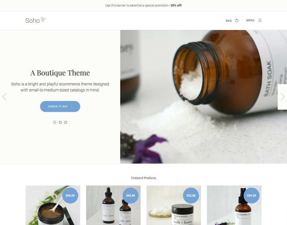 Soho is a bright and playful theme designed with artisans and small businesses in mind. Ample white space and clean typography let you show off your products in style. Colorful buttons and sales-ready calls to action invite customers to engage with your brand and get to the checkout—fast.