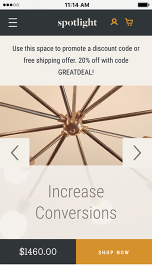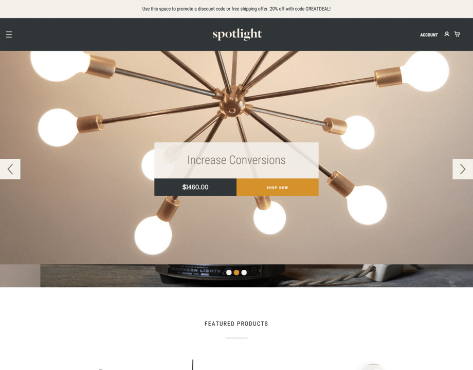 Spotlight is a bold and engaging theme designed to feature your top products and promotions. Its homepage combines stunning, full-width imagery with prominent promotion boxes, customer reviews and quick-add-to-cart functionality. Easily customizable, Spotlight puts the focus on what matters most—driving sales.