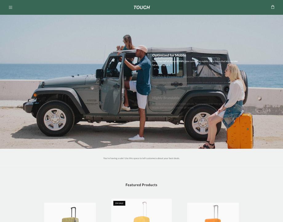 Touch is a versatile theme built with mobile shoppers in mind. Its split-screen design and customizable homepage grid put your products front and center, while large images and horizontal swiping are perfectly suited to handheld devices. Designed in collaboration with New York fashion icon LaQuan Smith, Touch is as stylish as it is scalable.