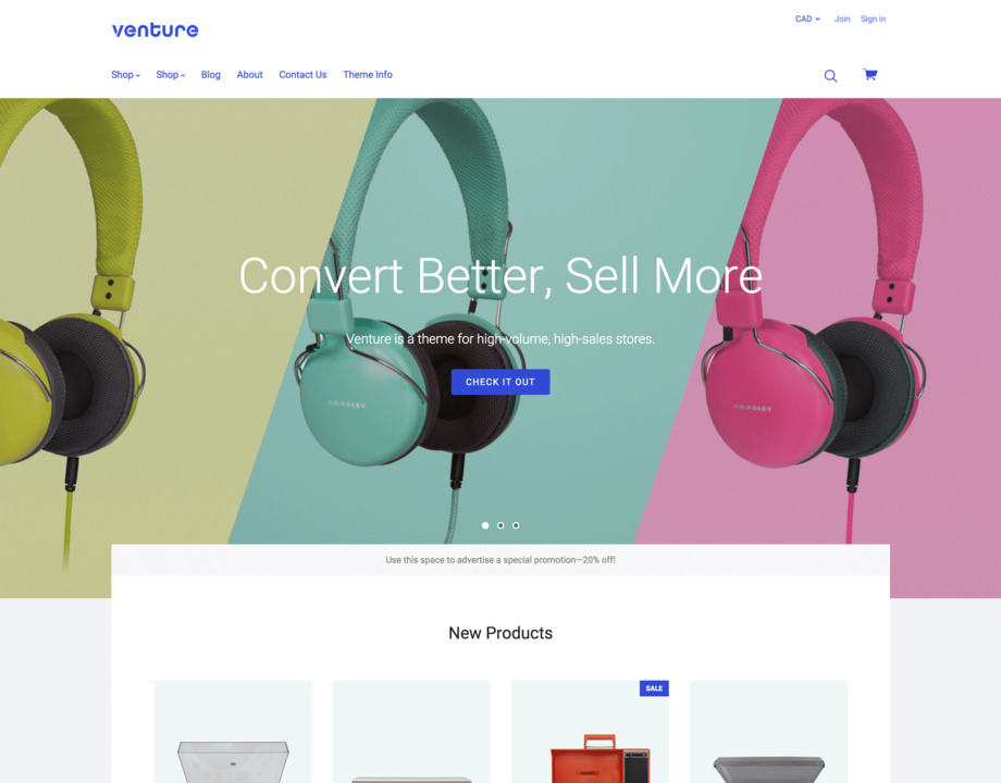 Venture is a theme for fast-growing online stores. It's ultra-powerful, versatile, and easily supports large catalogs with a wide range of products. In-depth filtering and prominent product reviews lend your store an enterprise feel, while Venture's modern design remains stylish and sophisticated.