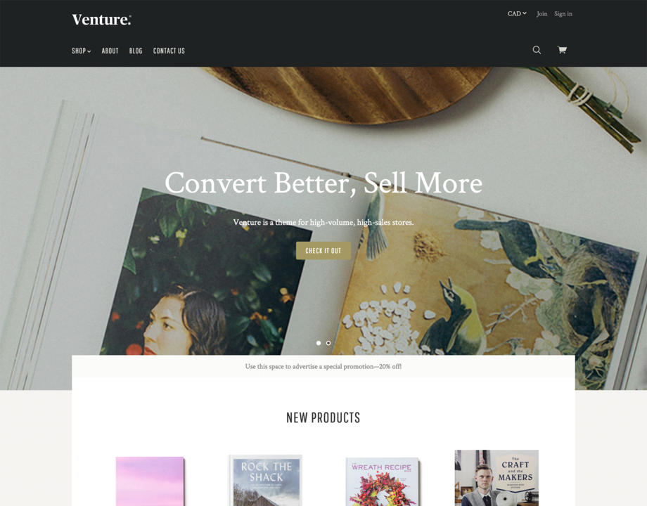 Venture is a theme for fast-growing online stores. It's ultra-powerful, versatile, and easily supports large catalogs with a wide range of products. In-depth filtering and prominent product reviews lend your store an enterprise feel, while Venture's modern design remains stylish and sophisticated.